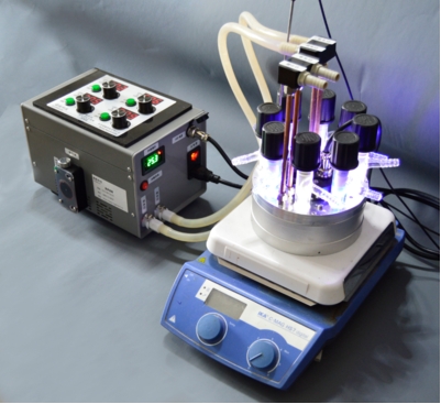 RLH-18 | 八位平行光反应系统,包括控制控制盒,8个LED光源座(光源任选),八位平行反应铝试管模块,铝制水冷盘,8个10ml带聚四氟塞反应管,8个搅拌子,外置循环水泵,及电源线,控制线,硅胶水管等。U盘内置操作指导视频。加热磁力搅拌器和水冷循环机需要另购。 |