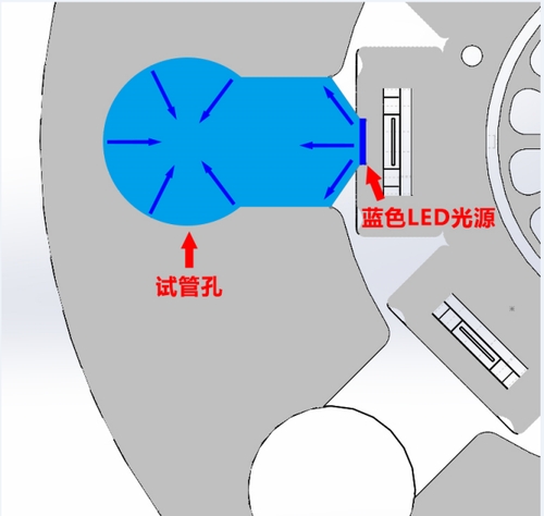 8位LED水冷头在装配了8个LED光源模块后,安装在试管适配模块的中心,每个LED对准一个试管孔。LED水冷头和试管模块之间进行了热隔离,这样即使模块处于低温,LED水冷头处于常温,两者也不会互相干扰。