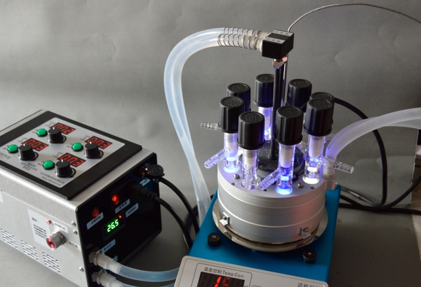 RLH-18八位光反应系统可以支持-30℃至80℃间不同反应温度,需要加热磁力搅拌器和外置循环冷水机的配合。10℃以下的反应温度,因为低温凝露问题,通常建议在手套箱、低温冰箱或我们特别提供的低温反应箱中进行。